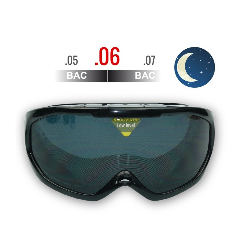 Les lunettes d'alcoolémie ALCOVISTA® Haute sensibilité, nocturnes simulent un taux d'alcoolémie entre 0,6 et 0,8 gr/litre , soit une consommation de 2 à 4 verres d'alcool.