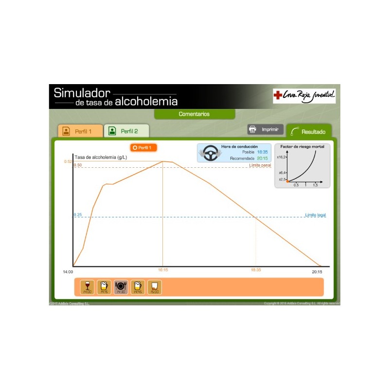Gemakkelijk te gebruiken ALCOSIMULATOR volgt de ontwikkeling van alcohol in het bloed van de eerste beker om volledig te elimineren, laat twee verschillende situaties en vergeleken wordt. De curve is interactief met de muis.