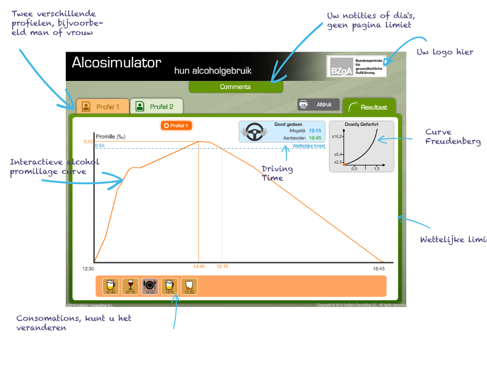 ALCOSIMULATOR is klantgericht met uw logo en uw eigen commentaar of cursussen om te helpen in hun workshops of lezingen.